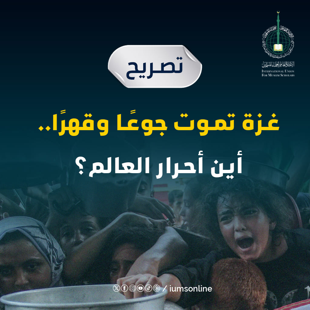الاتحاد العالمي لعلماء المسلمين: غزة تموت جوعًا وقهرًا.. أين أحرار العالم؟ (تصريح)