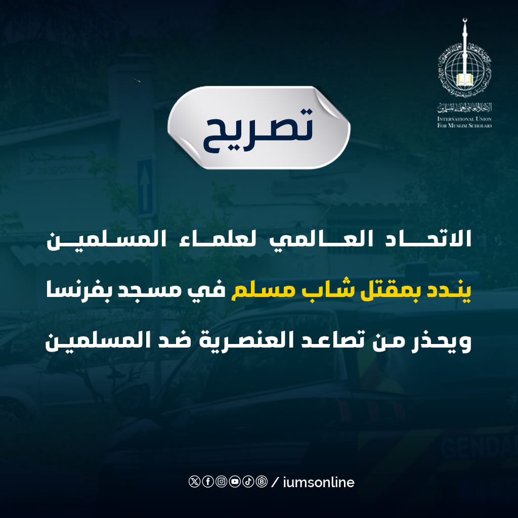 الاتحاد العالمي لعلماء المسلمين يندد بمقتل شاب مسلم في مسجد بفرنسا ويحذر من تصاعد العنصرية ضد المسلمين (تصريح)
