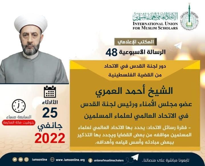 الرسالة الأسبوعية (49): القضية الفلسطينية أمانة هذه الأمة مع فضيلة الشيخ أحمد العمري – عضو مجلس الأمناء ورئيس لجنة القدس في الاتحاد العالمي لعلماء المسلمين
