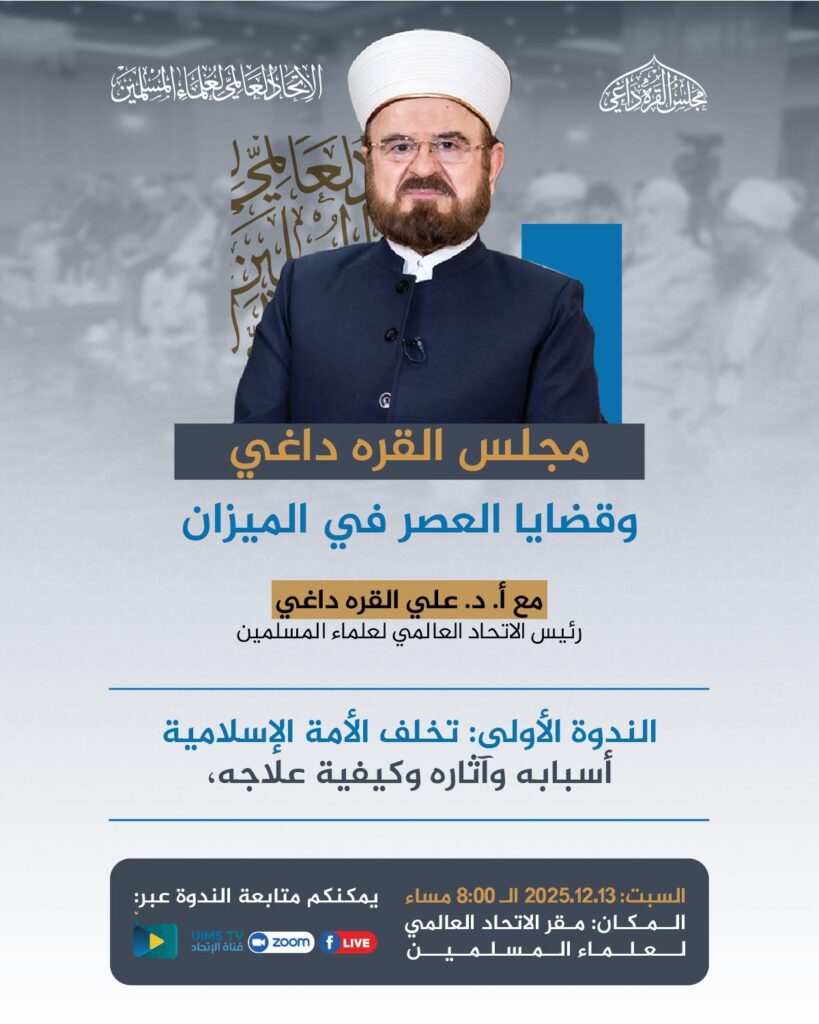 استئناف جلسات مجلس سماحة الشيخ علي القره داغي: ندوة حول “تخلّف الأمة الإسلامية وأسباب معالجته”