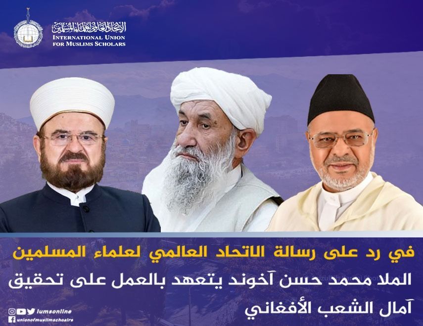 تلقى أصحاب الفضيلة الشيخ الدكتور أحمد الريسوني رئيس الاتحاد العالمي لعلماء المسلمين، والشيخ الدكتور علي محي الدين القرة داغي الأمين العام للاتحاد، رسالة من الملا محمد حسن أخوند رئيس وزراء إمارة أفغانستان الإسلامية.