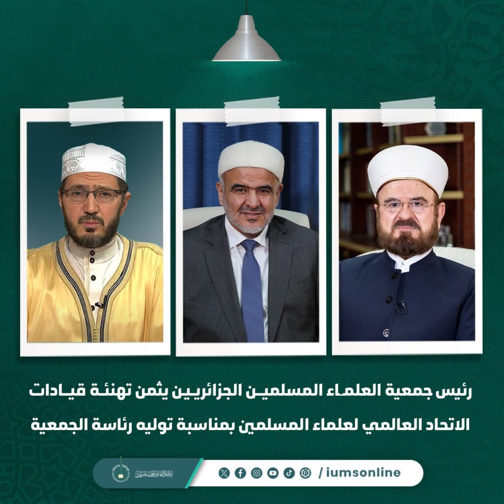 رئيس جمعية العلماء المسلمين الجزائريين يثمن تهنئة قيادات الاتحاد العالمي لعلماء المسلمين بمناسبة توليه رئاسة الجمعية