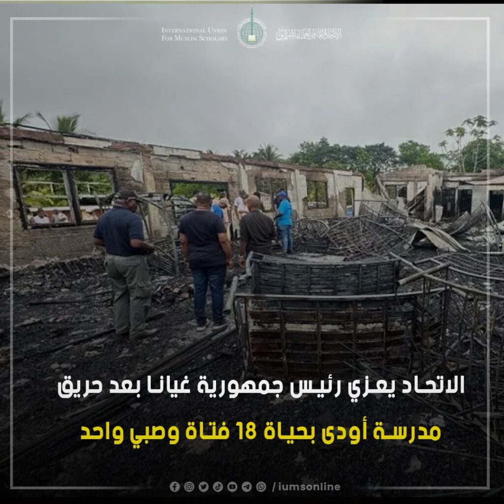 الاتحاد العالمي لعلماء المسلمين يعزي رئيس غيانا بعد الحريق الكارثي الذي أودى بحياة 18 فتاة وصبي في مدرسة للإناث