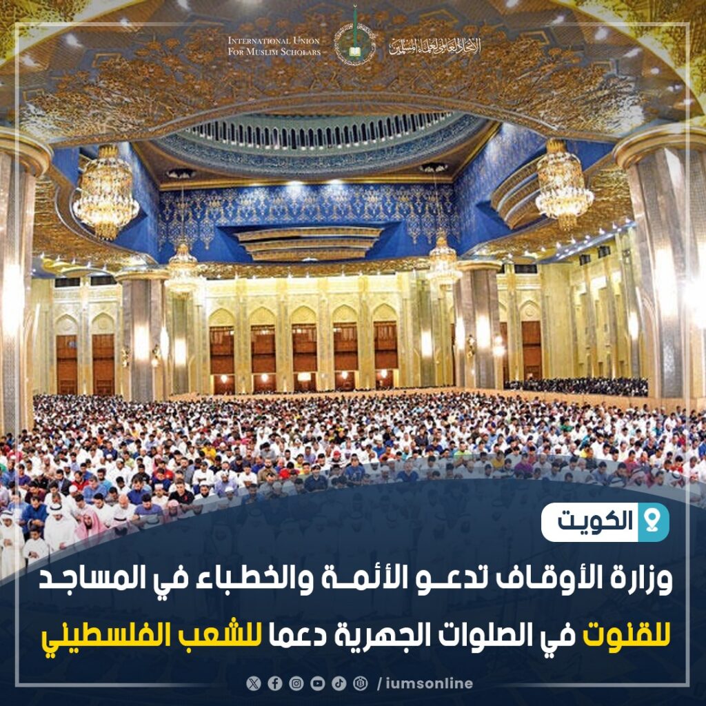 أصدرت وزارة الأوقاف والشؤون الإسلامية الكويتية تعميمًا إداريًا للأئمة والخطباء في المساجد للقنوت في الصلوات الجهرية والدعاء للشعب الفلسطيني الشقيق نظرًا للتصعيد الحاصل في قطاع غزة والأراضي الفلسطينية المحتلة