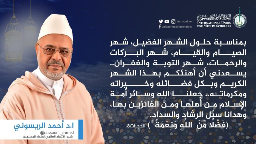 الريسوني يهنئ الأمة الإسلامية بحلول الشهر الفضيل (شهر رمضان)