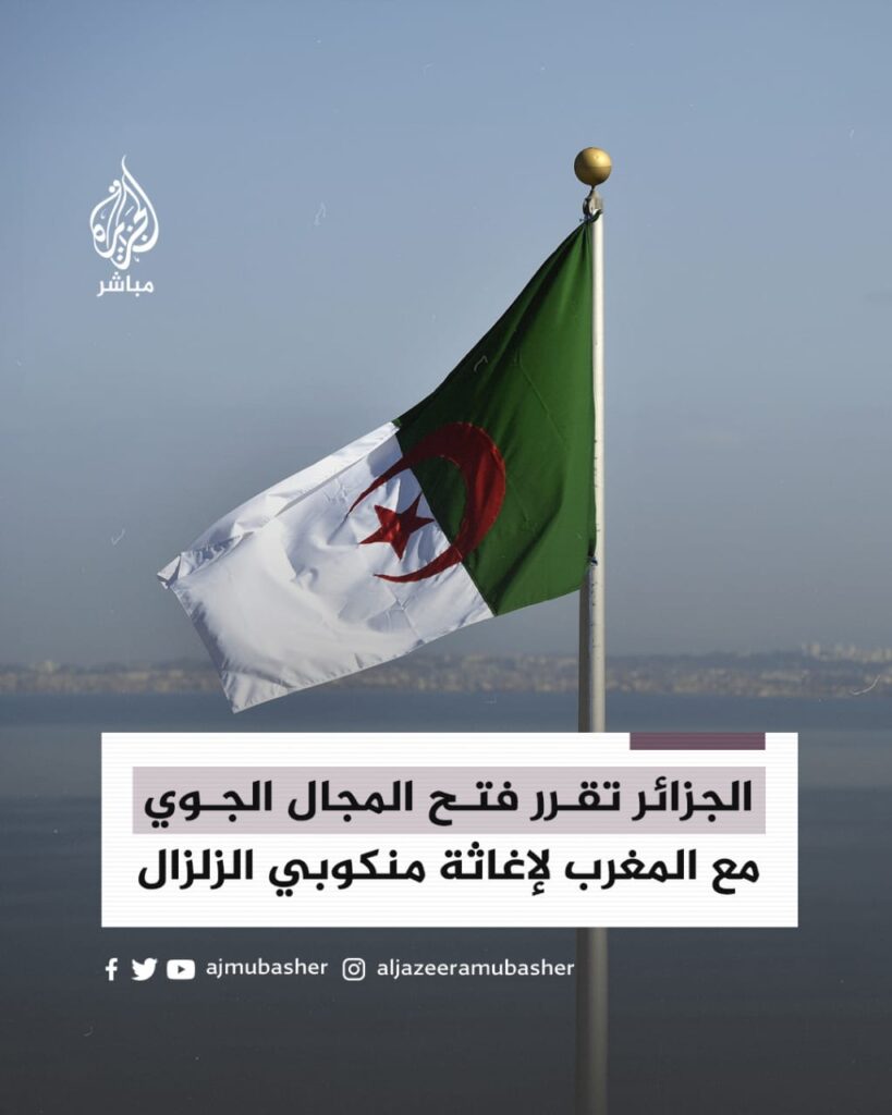 #الجزائر نے مراکش کے متعدد علاقوں میں آنے والے زلزلے کے متاثرین کو امداد فراہم کرنے کے لیے۔اور انسانی امداد کی آمد کو آسان بنانے کے لیے اپنی فضائی حدود کھولنے کا اعلان کیا۔ #