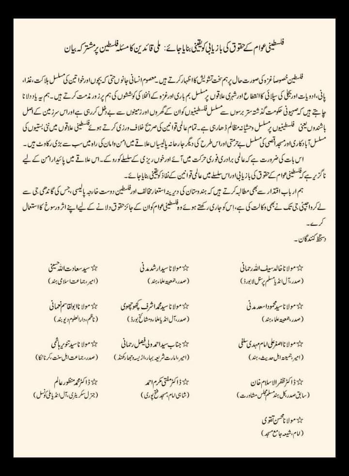 فلسطینی عوام کے حقوق کی بازیابی کو یقینی بنایا جائے: انڈیا کے علماء و ملی قائدین کا مسئلہ فلسطین پر مشترکہ بیان