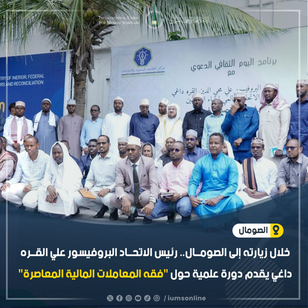 اتحادِ عالمی کے صدر، پروفیسر علی قرہ داغی نے ، صومالیہ کے اپنے دورے کے دوران”فقہ مالیات اور لین دین سے وابستہ مسائل “کے زیر عنوان محاضرہ پیش فرمایا ۔