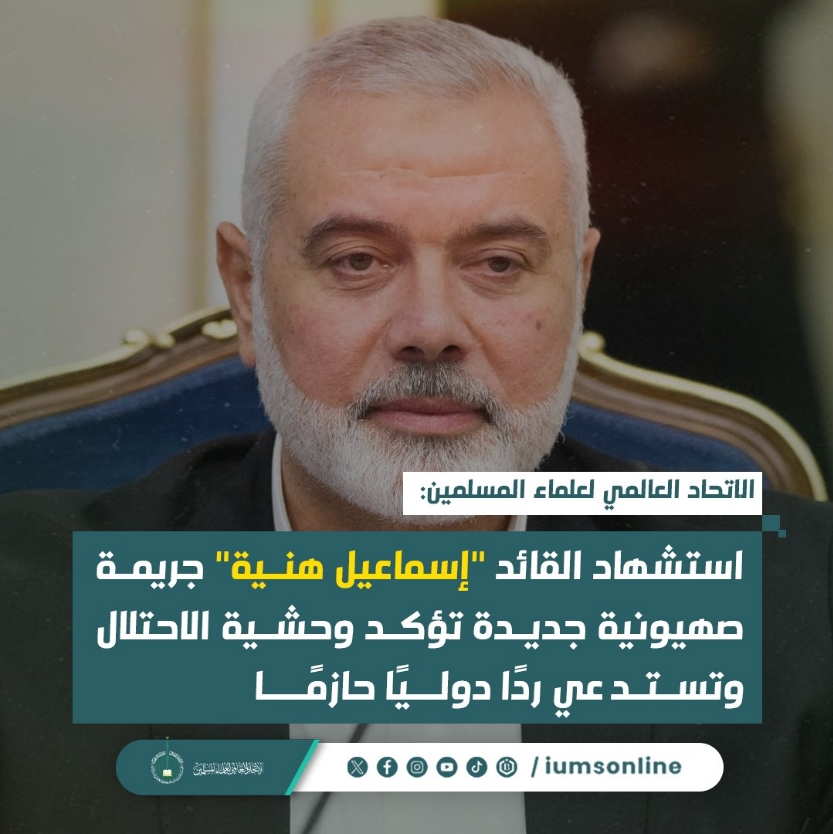 انٹر نیشنل یونین فار مسلم اسکالرز : قائد مجاہد اسماعیل ہنیہ کی شہادت ایک نیا صہیونی جرم ہے جو غاصبانہ قبضے کی بربریت کی عکاسی کرتا ہے اور ایک مضبوط بین الاقوامی ردعمل کا متقاضی ہے۔